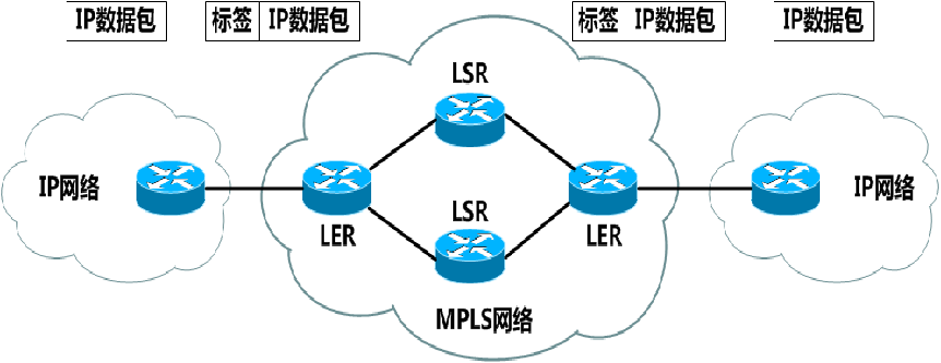 MPLS(Multi-Protocol Label Switching,多协议标签交换)是用一个短而定长的标签封装网络层数据包,并将封装后的报文转发到支持MPLS技术的交换机或路由器,交换机或路由器根据标签值转发报文。普通的IP网络,只要将路由器升级能支持MPLS技术,就成为MPLS网络。MPLS网络可以与普通IP网络共存,报文可以在IP网络和MPLS网络之间转发。