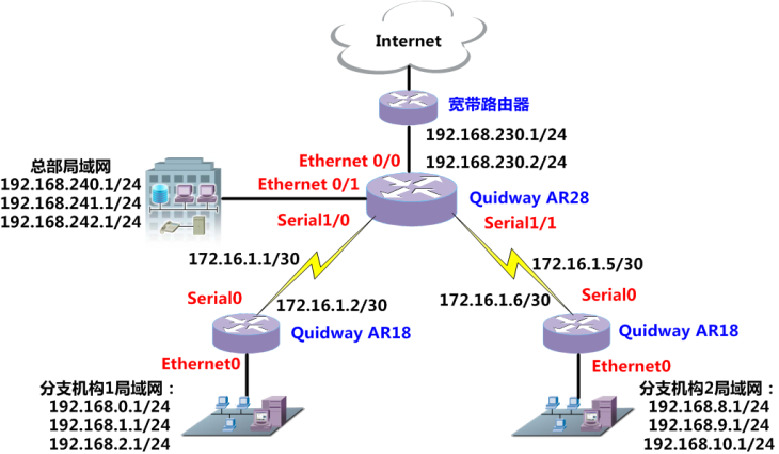 总部 | 192.168.240.1/24 | 172.16.1.1/30 (连接到分支机构1) 172.16.1.5/30 (连接到分支机构2) | Quidway AR 28 |