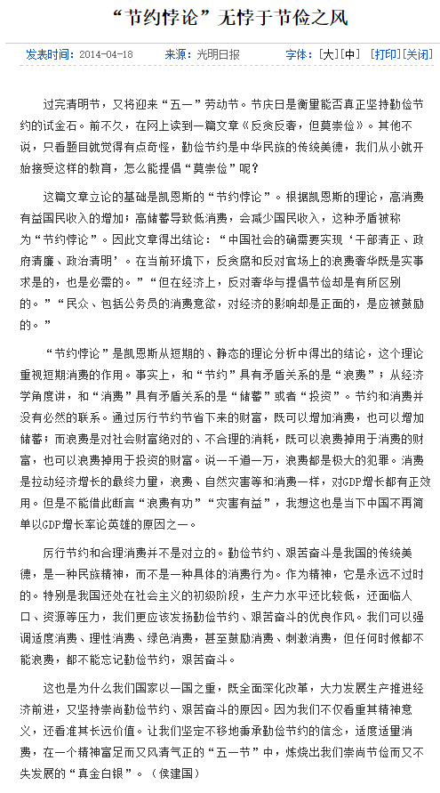 ▲有关此问题的观点文章可见:《“节约悖论”无悖于节俭之风》(侯建国,光明日报,2014.4.18),相关链接网址为:“节约悖论”无悖于节俭之风。