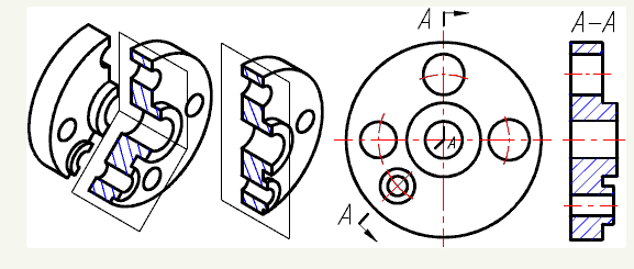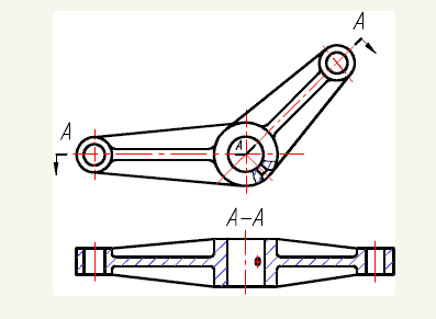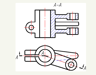 作旋转剖时,应在剖切面转折和起迄处画上剖切符号、投影方向的箭头及大写字母A,在剖视图上方注明相同的大写字母“A-A”。