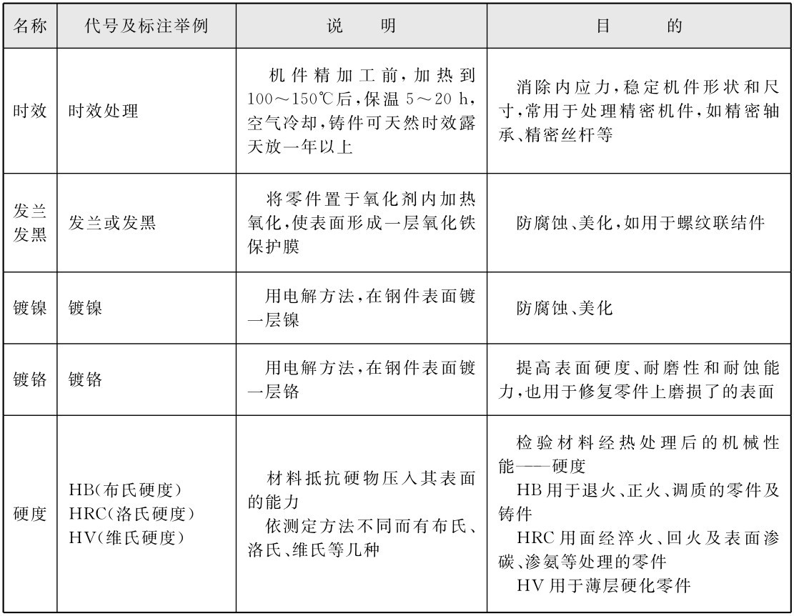 名称 代号及标注举例 说 明 目 的退火 Th 加热—保温—随炉冷却用来消除铸、锻、焊零件的内应力,降低硬度,以利切削加工,细化晶粒,改善组织,增加韧性正火 Z 加热—保温—空气冷却淬火C C84(淬火回火HRC45~50)调质T T235C(调质至HB220~250)高频淬火G G52(高频淬火后回火至HRC50~55)渗碳淬火S—C S0.5~C59(渗碳层深0.5,淬火硬度HRC56~62)氮化D D0.3~900(氮化深度0.3,硬度大于HV850)氰化Q Q3(氰化淬火后,回火至HRC56~62)用于处理低碳钢、中碳结构钢及渗碳零件,细化晶粒,增加强度和韧性,减少内应力,改善切削性能加热—保温—急冷提高机件强度及耐磨性。但淬火后引起内应力,使钢弯脆,所以淬火后必须回火淬火—高温回火 提高韧性及强度。重要的齿轮、轴及丝杆等零件需调质用高频电流将零件表面加热—急速冷却提高机件表面的硬度及耐磨性,而心部保持一定的韧性,使零件既耐磨又能承受冲击,常用来处理齿轮等将零件在渗碳剂中加热,使渗入钢的表面后,再淬火回火渗碳深度0.5~2mm提高机件表面的硬度、耐磨性、抗拉强度等。适用于低碳、中碳[w(C)<0.4%]结构钢的中、小型零件将零件放入氨气内加热,使氮原子渗入钢表面,氮化层0.025~0.8mm,氮化时间40~50h提高机件的表面硬度、耐磨性、疲劳强度和抗蚀能力,适用于合金钢、碳钢、铸铁件,如机床主轴、丝杆、重要液压元件中的零件钢件在碳、氮中加热,使碳、氮原子同时渗入钢表面,可得到0.2~0.5氰化层提高表面硬度、耐磨性、疲劳强度的耐蚀性,用于要求硬度高、耐磨的中、小型薄片零件、刀具等