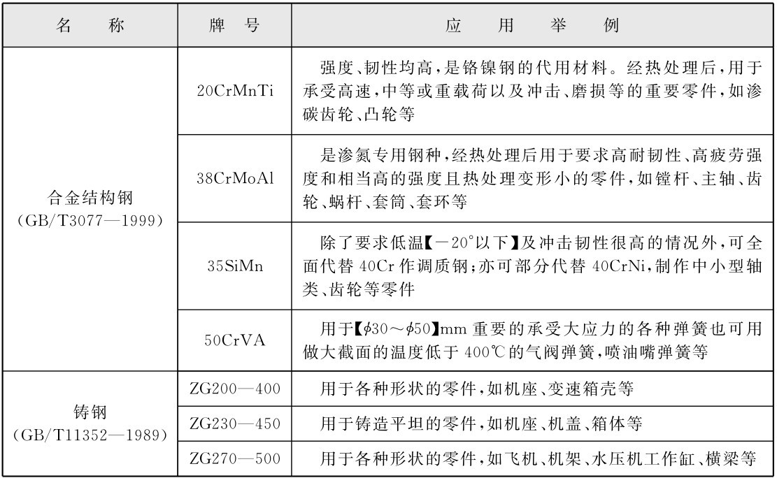 名 称 牌 号 应 用 举 例Q215 Q235 塑性较高,强度较低,焊接性好,常用做各种板材及型钢碳素结构钢(GB/T700—2006) Q275 强度较高,可制作承受中等应力的普通零件,如紧固件、吊钩、拉杆等;也可经热处理后制造不重要的轴15 20 35 40 45优质碳素结构钢(GB/T699—1999) 55塑形、韧性、焊接性和冷冲性很好,但强度较低。用于制造受力不大,韧性要求较高的零件、紧固件、渗碳零件及不要求热处理的低荷载零件,如螺栓、螺钉、拉条、法兰等有较好的塑形和适当的强度,用于制造曲轴、转轴、轴销、杠杆、连杆、横梁、链轮、垫圈、螺钉、螺母。这种钢多在正火和调制状态下使用,一般不作焊接作用用于要求强度较高,韧性要求中等的零件,通常进行调质或正火处理。用于制造齿轮、齿条、链轮、轴、曲轴等;经高频表面淬火后可代替渗碳钢制作齿轮、轴、活塞销等零件经热处理后有较高的表面硬度和强度,具有较好的韧性,一般经正火或淬火,回火后使用。用于制造齿轮、连杆、轮圈及轧辊等。焊接性及冷变性均低65 一般经淬火中温回火,具有较高弹性,适用于制作小尺寸弹簧15Mn性能与15钢相似,但其淬透性、强度和塑性均高于15钢。用于制作中心部分的力学性能要求较高且需渗碳钢的零件。这种钢焊接性好16Mn 性能与65钢相似,始于制造弹簧、弹簧垫圈、弹簧和片,以及冷拔钢丝【≤7mm】和发条20Cr 用于渗碳零件,制作受力不太大,不需要强度很高的耐磨零件,如机齿床轮、齿轮轴、蜗杆、凸轮活塞销等合金结构钢(GB/T3077—1999) 40Cr 调制后强度比碳钢高,常用做中等截面,要求力学性能比碳钢高的重要调至零件,如齿轮、轴、曲轴、连杆、螺栓等
