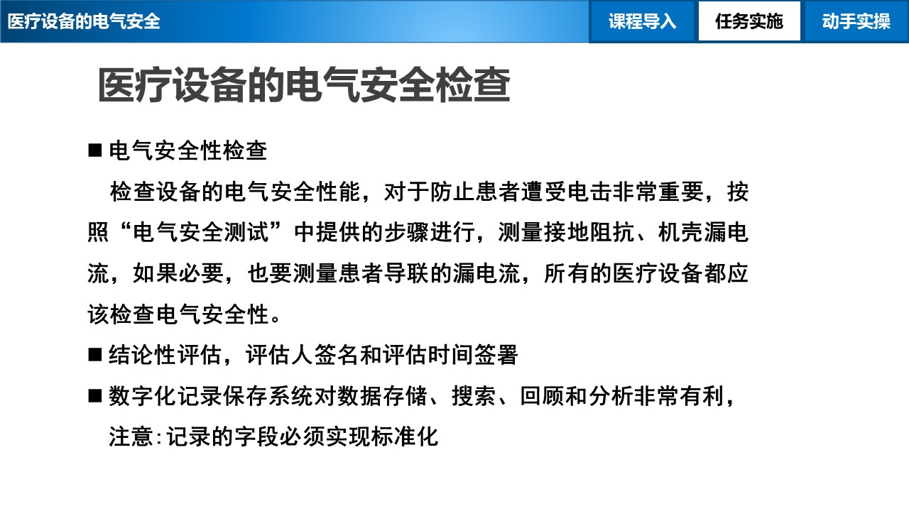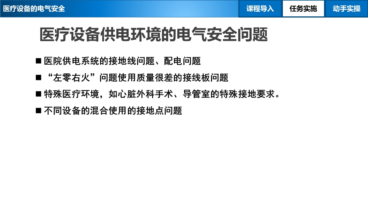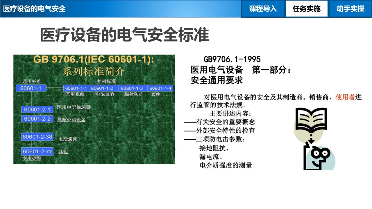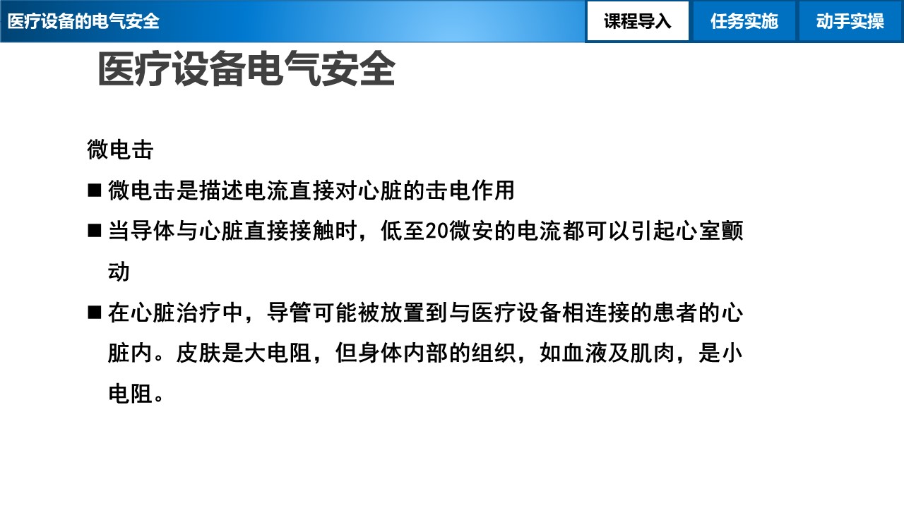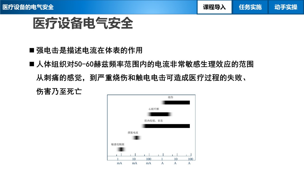 1、知识目标:(1)了解医用电子仪器的安全风险