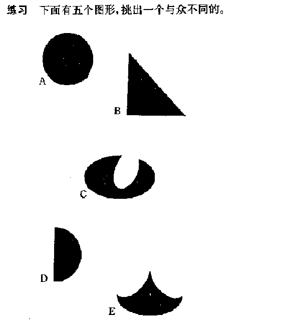 1、如果你选择B,恭喜你,你答对了,因为图形B是唯一全部由直线构成的图形。