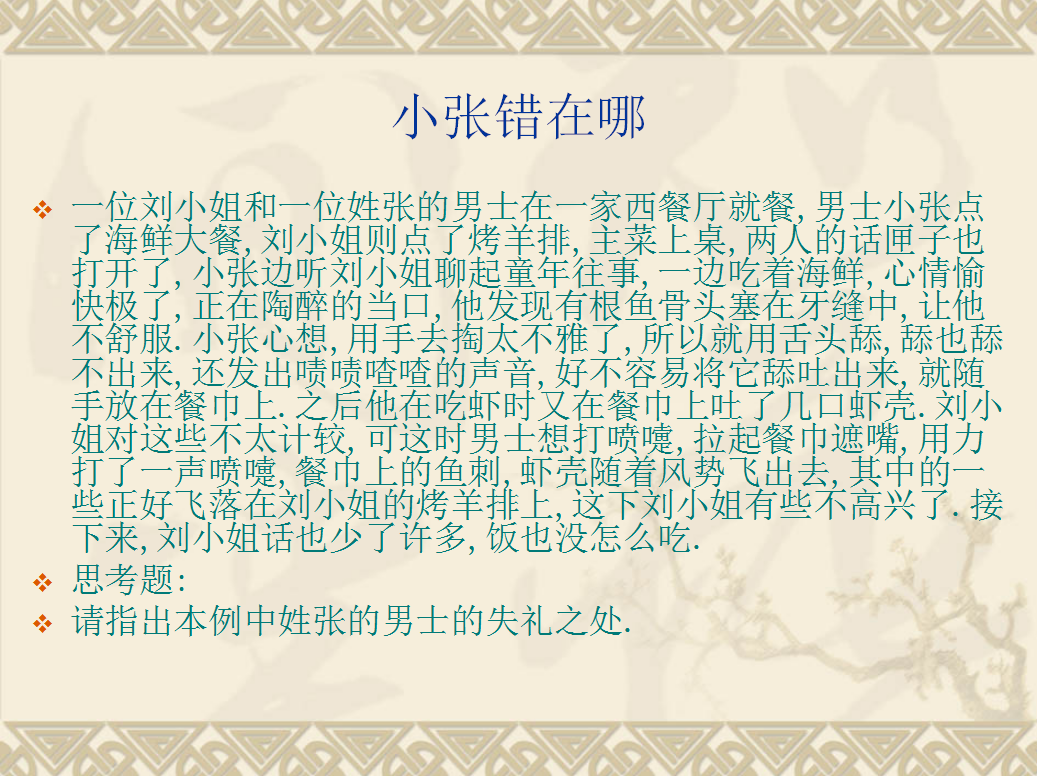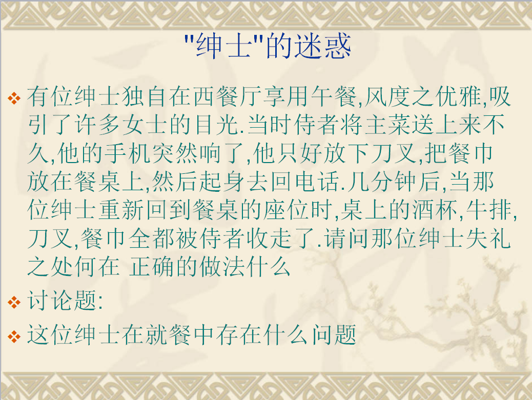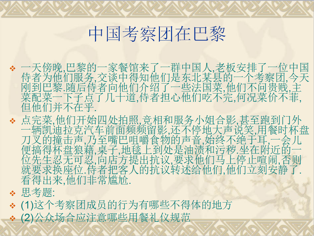 Jay is a Chinese business man. Once upon a time, he went to Saudi Arabia for business trip. He knew that it’s proper to give the waiters or waitresses tips for being grateful for their service. But when the middleman did the service for them, he said “thank you” and then found the atmosphere was a little bit embarrassing, but he didn’t know why. Besides, Jay found the Saudis didn’t use any tools for having dinner but used their right hands for food, he couldn’t have more food because he felt it weird.