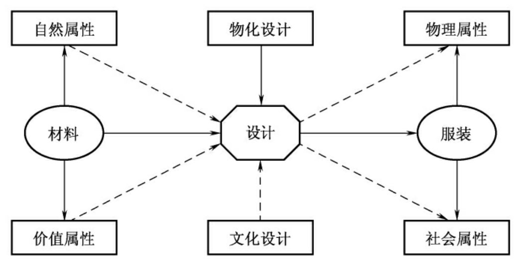 显然,服装材料必须经过设计环节才能制成服装,因此在材料、设计和服装之间存在一种刚性相生关系(实线相连);而服装材料和服装理所当然地具备着自然属性(或物理属性)和价值属性(或社会属性),换言之,自然属性和价值属性是材料和服装必然表现出来的属性,因此它们之间也是实线相连;但是在设计过程中能不能把材料的自然属性和价值属性运用得当,发挥材料应有的效果,全在设计师的掌控之中。高超的设计师精通材料性能,能够把材料的各种属性很好地融入设计中去,即设计中既有物化设计又有文化设计,设计出的作品就有了(输出了)得当的物理属性和社会属性;平凡的设计师可能只会进行物化设计,设计出来的只是一件普通的衣服而已;而一个水平较低的设计师很可能由于不了解材料的性能,连起码的物化设计都完成不了(如采用了无弹性的面料,开口又不合适,致使人穿不进去),所以这几处都是用虚线相连,意味着在用材料进行服装设计这个必然过程中,设计师能不能设计出好作品,完全是个未知数,一切有赖于设计师对相关材料知识的掌握和运用能力。