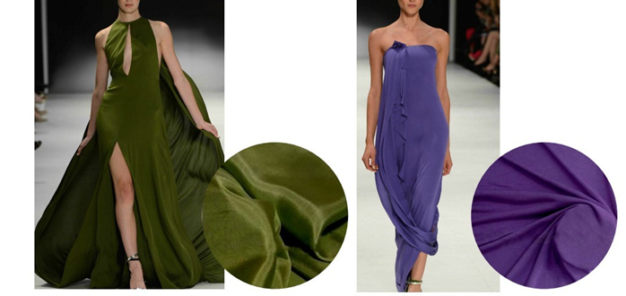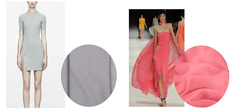 采用轻薄悬垂的面料制作的服装,给人流动的美感,使服装更洒脱飘逸,如雪纺贴身且飘逸、悬垂,是体现女性柔和、性感的首选。而垂感不强的材料用在服装中,则显得温暖厚实。
