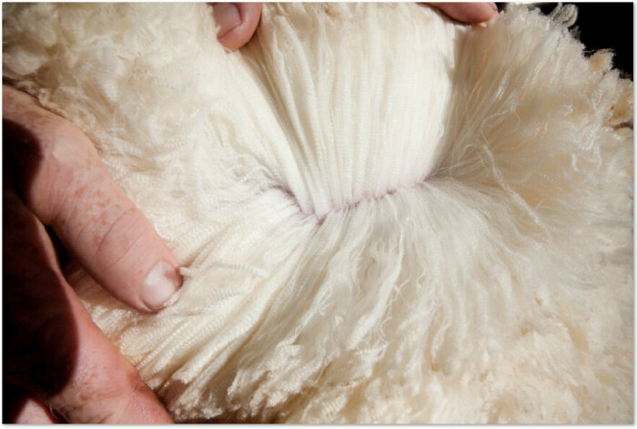 墨尔本美丽诺羊毛纤维长在10CM(100mm)左右,有天然的卷曲度和很好的弹性
