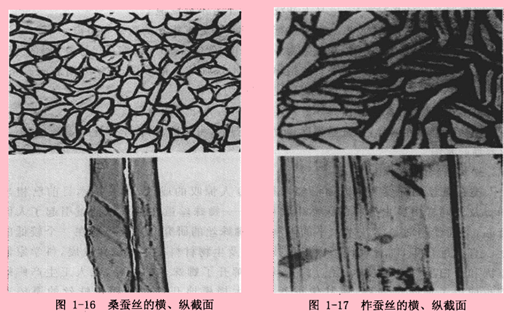 | 柞蚕丝 | 表面如树干状,粗细不匀 | 相当扁平的三角形或半椭圆形 |