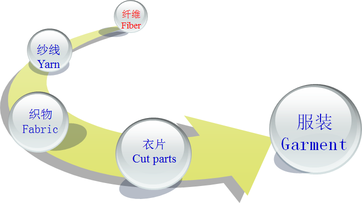 纤维原料----纱线----织物----服装
