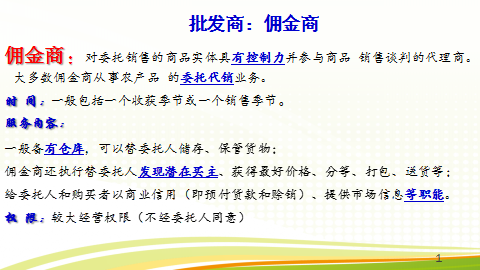 农产品运销商是处于农产品生产者和最终消费者之间,参与农产品流通业务,促进买卖行为发生和实现的独立的流通主体,即农产品运销商。运销商种类繁多,各自承担的流通职能也很不一样。
