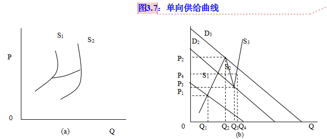 传统的供给曲线为一条由左下方向右上方延伸的圆滑曲线,当价格上涨时,供给量增加,价格下跌时,供给量则沿着原来的供给曲线减少。但多数农产品的供给却常常违反此原则,当价格上涨时,供给量增加,当价格下跌时,供给量并非沿原来的供给曲线减少,而是沿着另一条弹性较小的供给曲线减少,甚至沿着一条负斜率的供给曲线增加,这就是单向供给现象。