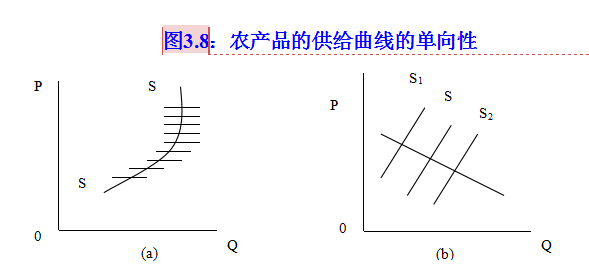 另一种观点认为,单向供给曲线形成的原因,一方面是由于农业生产所需的固定成本很大,占总生产成本的绝大比率,使得生产成本无法随产量的增减而等比率变动。当市场价格下跌时,农民如果减少产量,则将使单位产量的固定成本负担加重,因此固定成本一旦投入,就须继续生产。加上农业劳动力多为农民自身,视为固定成本,不像雇工在价格低落时可暂予解雇;另一方面,农民分散,处于完全竞争状态,当价格下跌时,无法集体减产以提高价格,而是以增加产量来弥补因价格下跌而造成的损失,所以当价格下跌时,供给量增加。农民处在此不利条件下,惟有寻求改进途径,如引进新的生产技术以提高产量并降低生产成本。如果此时市场需求量增加,价格再度上涨,则供给量沿着另一条新的供给曲线增加,如图3.7(b)中S3所示。由于多数农产品的供给曲线具有这种特性,在市场需求减少时,价格下跌幅度往往较大。