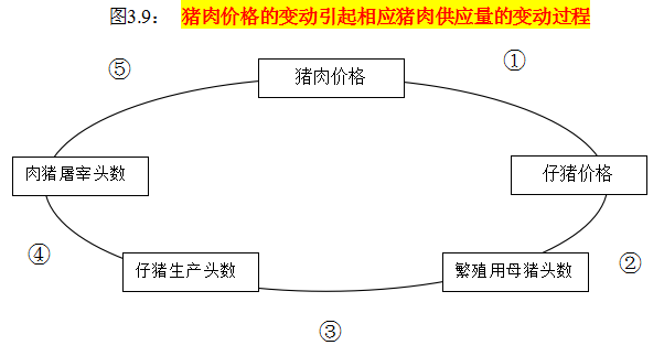 农产品价格的变动对农产品的需求变动的影响是快速的,一般而言,价格下降,需求量立即增加;价格上涨,需求量立即下降。价格调节农产品需求没有时差。而农产品价格变动引起农产品的供给变动不是立即的,农产品的供给变动要比农产品价格变动晚些。例如,猪肉价格的变动到引起相应猪肉供应量的变动需要约两年时间,其变动过程如图3.1:(必须理解!!)