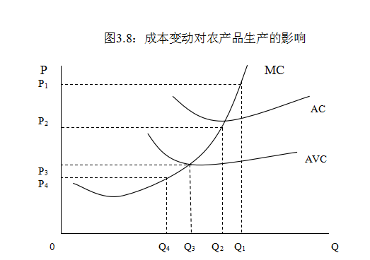 在完全竞争市场里,个别生产者的供给曲线是由其边际成本曲线导出的。就短期而言,个别生产者的供给量是根据P=MC来决定的,如图3.8所示,当市场价格为OP1时,供给量为Q1,此时平均收益大于平均成本,生产者有利可图,当然会生产。但价格为P2时,供给量为Q2,此时平均收益小于平均成本,但大于平均变动成本,生产者若继续生产,其收益不仅可支付变动成本,而且可收回部分固定成本,若停止生产则全部固定成本均浪费掉,则生产者仍会继续生产。当价格为P3时,供给量为Q3,此时平均收益恰等于平均变动成本,生产或不生产均同样要损失固定成本,所以生产者可生产,也可不生产。当价格为P4时,供给量为Q4,此时平均收益小于平均变动成本,不生产仅损失固定成本,继续生产连变动成本也无法全部收回,生产者当然会停止生产。由此可知,在完全竞争市场中,短期个别生产者的供给曲线(如图3.8所示)为大于AVC最低点的MC曲线部分。所有生产者供给水平相加即为市场供给曲线。一般农产品市场是完全竞争市场,理论上,供给的决定也如此。因此,成本结构是影响农产品生产的重要因素。
