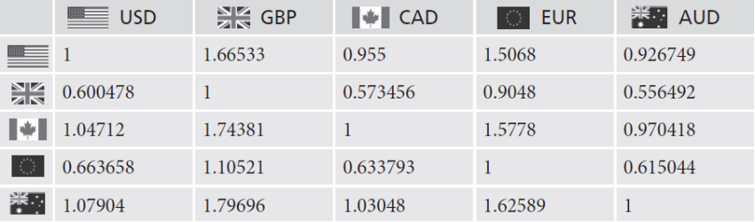 C. The following chart provides the rate of exchange among five currencies on a certain day.