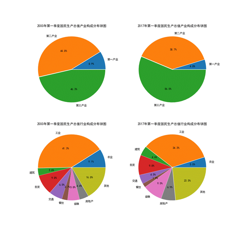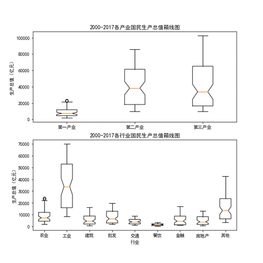 3. 仿例7.19,即实例:国民生产总值数据可视化,进一步绘制各行业构成分布直方图、饼图、箱线图等,以便直观阅读和理解数据,如图7-22所示。