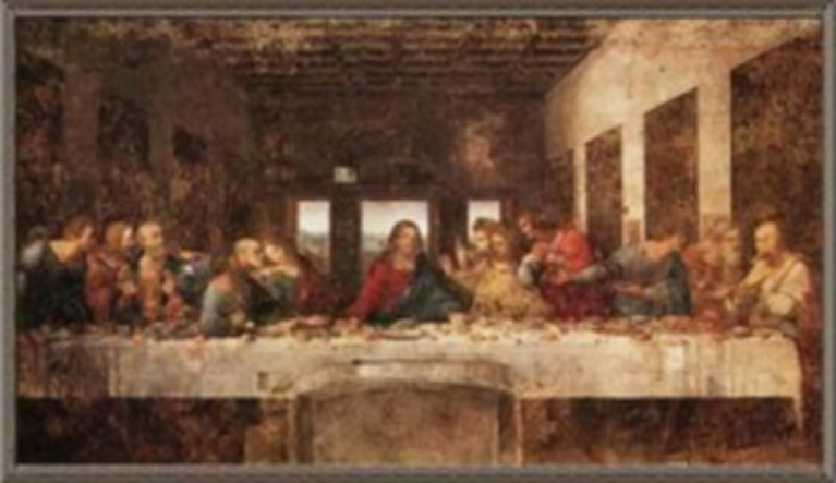 《最后的晚餐》是意大利艺术家达·芬奇所创作,以《圣经》中耶稣跟十二门徒共进最后一次晚餐为题材。画面中人物的惊恐、愤怒、怀疑、剖白等神态,以及手势、眼神和行为,都刻画得精细入微,惟妙惟肖,是所有以此题材创作的作品中最著名的一幅。收藏于意大利米兰圣玛利亚感恩教堂。