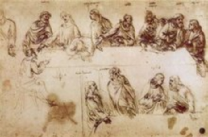 温莎皇家图书馆和威尼斯藏有的素描的重心逐渐从整体布局转移到单独人物形象特征上面。温莎皇家图书馆藏有著名的系列头像,大多数用红粉笔画成,有一些已经画得比较完整:犹大、彼得、大雅各、圣菲利普(最后两个形象用的是同一个模特,只不过在图画中被赋予了鲜明的个性特征)。其中有一幅圣约翰双手的习作,画面非常精美;还有一幅习作上画着圣彼得的衣袖。"福斯特笔记本"中还有一些简短的评论,对这些习作进行了补充---某位来自帕尔马的亚历山大为耶稣的手提供原型;"住在比塔的克里斯托法诺·达·卡斯蒂廖内的头部的形状很美"。其中有一处笔记,标题非常简单,就写着"耶稣"两字,达·芬奇在下面写着"摩塔洛红衣主教手下的乔瓦尼.孔蒂",这个人可能是耶稣的模特。