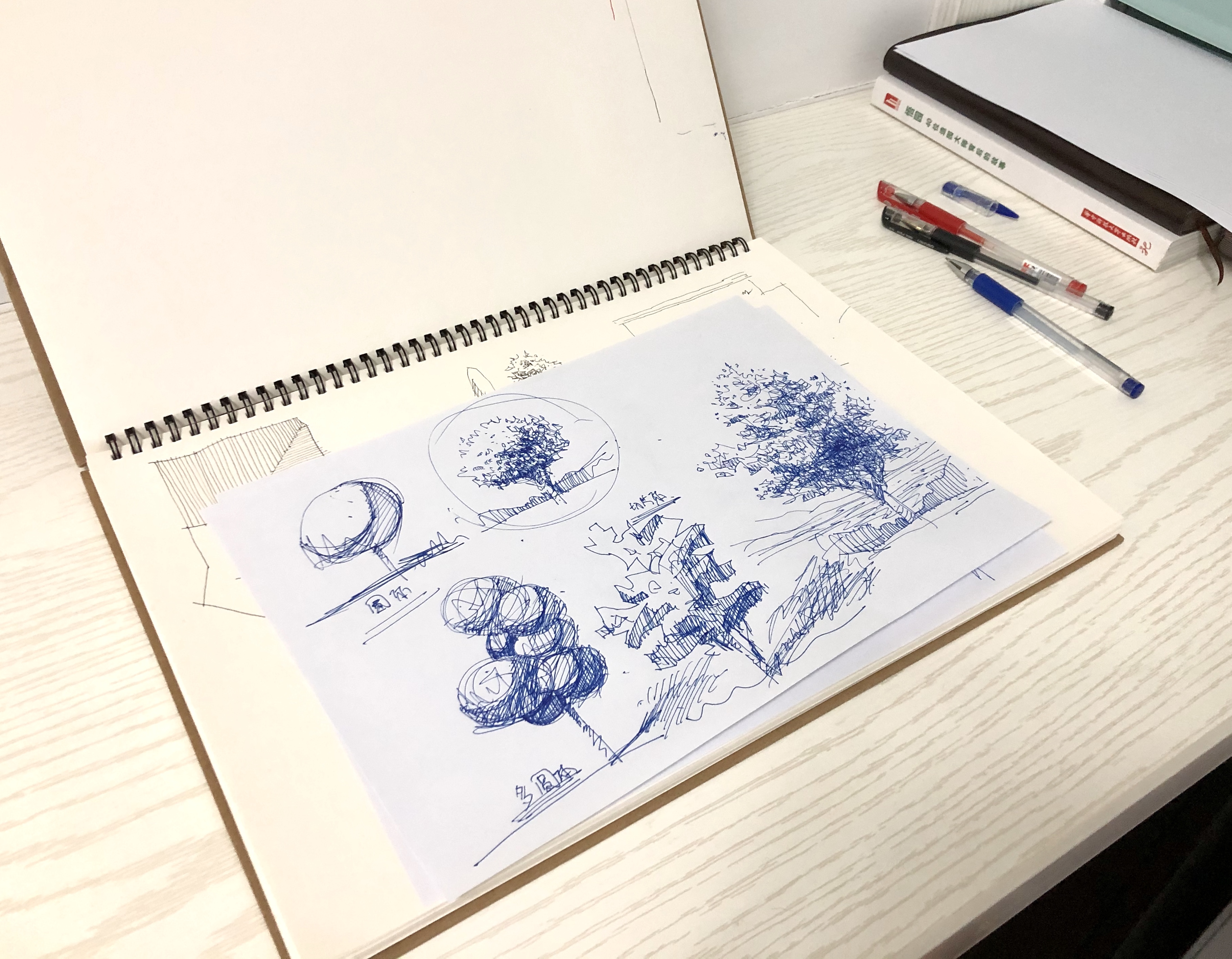 画速写的过程中尽量少使用不确定的线条,尽量做到画面的线条结实有力度,否则会让画面显得凌乱。绘画的顺序是确定枝干的位置和树叶大致的范围即可,树叶部分用曲折的折线圈出,再用不规则形形表达出散落的树叶,让画面更生动。细节部位根据画面需求自行添加。