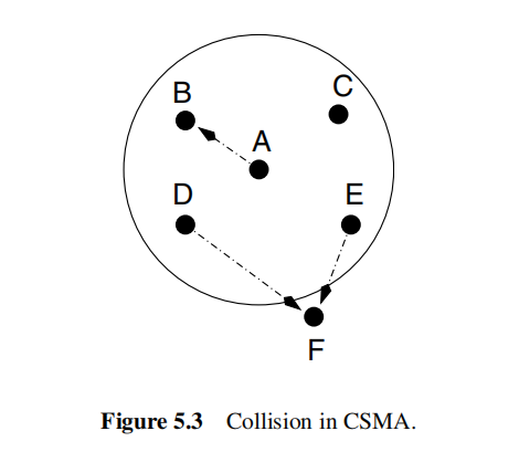 IFS持续时间可确保节点仅在信道空闲时进行传输,并有助于防止冲突。如果在IFS期间感知到信道为繁忙,则确定另一个节点正在发送一个数据包。图5.3说明了这种情况。当节点A向节点B发送一个包时,能够听到A传输的节点C、D和E如果有一个包要发送,将延迟它们的发送。例如,让我们假设所有三个节点C、D和E都有一个数据包要传输。由于在载波感知过程中会感知到信道繁忙,它们将把传输推迟到节点A的传输结束。然而,在节点A的传输结束时,所有三个节点都会感知到信道为空闲状态,并将尝试同时发送它们的数据包。这反过来又会在任何可以从任何两个节点(节点F)接收数据包的节点上导致冲突。为了防止这种冲突,在CSMA中,节点在传输数据包之前会随机延迟一段时间。这被称为后退。