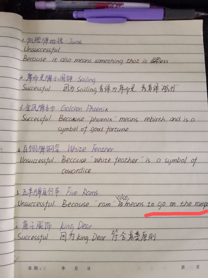 最后一部分请参照何雪儿的答案,我们在考虑翻译名称时,需要从文化角度进行思考,无论是发音还是事物内涵意义,都要想一想是否能符合目的语国家文化,至少不能与之相违背。请注意何雪儿同学版本的答案有一处划了下划线,因为照片没有拍全,这里补充一下:go on the rampage暴跳如雷,横冲直撞。因为ram作名词有公羊的意思,引申义作动词有猛烈撞击的意思。