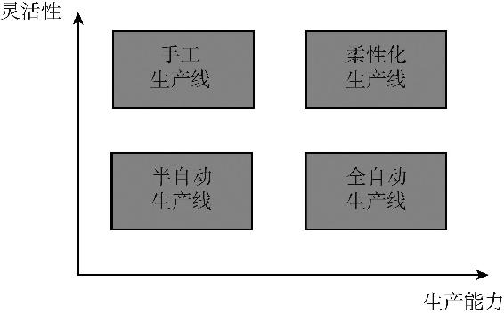 图4-4、图4-5所示分别为本课程用到的生产线以及相互之间的生产效率与灵活性的对比。