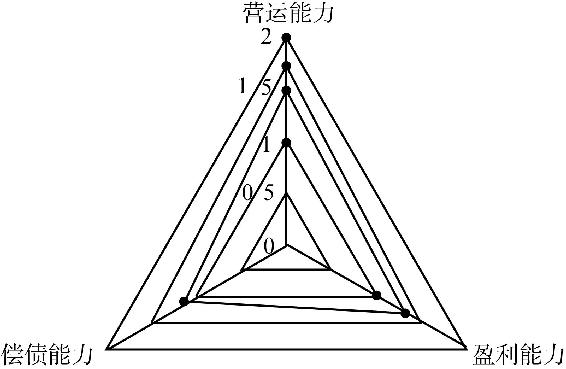 经营业绩综合评价的主要目的是与行业或特定的对手相比,发现自己的差距,以便在日后的经营中加以改进。在模拟训练中,一般参加训练的多个公司是同一个行业的,所进行的分析可以理解为同行业中的对比分析,以发现自己公司与行业的平均水平之间的差别。计算出了企业的各项经营比率后,各项单个的数据给人的印象是散乱的,我们无法判断企业整体的经营在同行业中处于一种什么样的位置。而通过图表可以清晰地反映出数据的各种特征。雷达图是专门用来进行多指标体系分析的专业图表。雷达图通常由一组坐标轴和三个同心圆构成。每个坐标轴代表一个指标。同心圆中最小的圆表示最差水平或是平均水平的1/2;中间的圆表示标准水平或是平均水平;最大的圆表示最佳水平或是平均水平的1.5倍。其中中间的圆与外圆之间的区域称为标准区,如图9-5所示。在雷达图上,企业的各项经营指标比率分别标在相应的坐标轴上,并用线段将各坐标轴上的点连接起来。图中坐标值1为行业的平均值,如果某项指标位于平均线以内,说明该指标有待改进。而对于接近甚至低于最小圆的指标,则是危险信号,应分析原因,抓紧改进。如果某项指标高于平均线,说明该企业相应方面具有优势。各种指标越接近外圆越好。