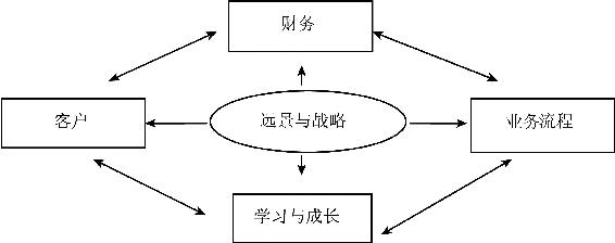 综合业绩评价制度BSC(The Balanced Score Card,平衡计分卡)是Kaplan和Norton等人从1990年开始进行的一个实地研究项目,目前已经在美国很多企业、政府和军事机构中得到应用。如图9-8所示,平衡计分卡包括四个角度:即财务、客户、业务流程以及学习与成长,通过这四个方面的协调及相互影响,能引导企业管理层对企业发展战略作全方位的思考,确保日常业务运作与企业远景和经营战略保持一致。