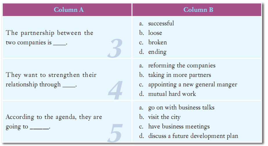 First of all, I’d like to say that 4 _______ the establishment of our partnership 3 years ago, each partner has had much to offer to 5 ___________. We are so glad to see that both sides have got satisfying 6 ___________ from the partnership. And we are also convinced that through mutual 7 ___________ the relationship between our two companies will 8___________ more and more strengthened in the future.