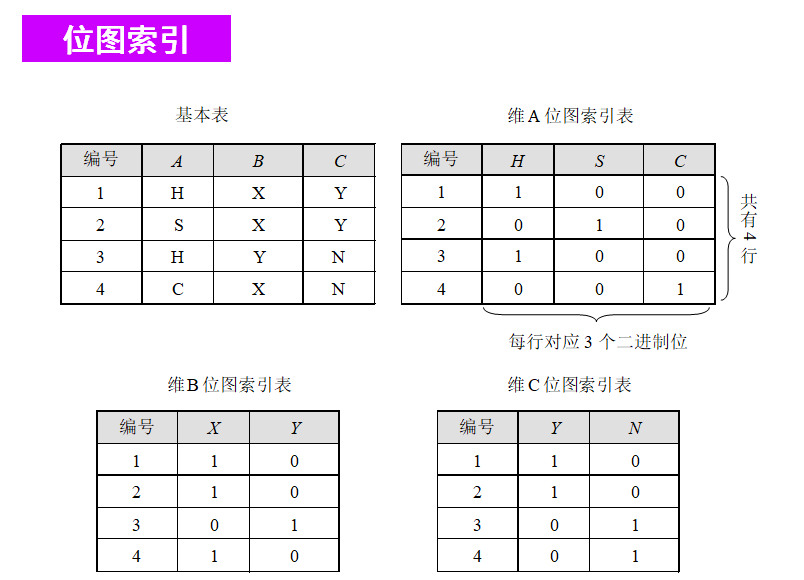 基本设计思想:用一个0、1位串来表示一个元组某一属性值的取值,位串中的位的位置表示了关系表中元组的位置。