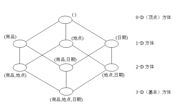 如给定(商品,地点)这个2维方体,在各维上聚集可以产生(商品)和(地点)两个1维方体,显然比从(商品,地点,日期)基本方体产生(商品)和(地点)方体要省时,但需要预先计算出(商品,地点)方体。