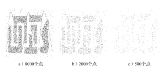 【补充】抽样与信息损失 一旦选定抽样技术,就需要选择样本容量。较大的样本容量增大了样本具有代表性的概率,但也抵消了抽样带来的许多好处。反过来,使用较小容量的样本,可能丢失模式或检测出错误的模式。图2.9a显示了包含8000个二维点的数据集,而图2.9b和图2.9c显示了从该数据集抽取的容量分别为2000和500的样本。该数据集的大部分结构都出现在2000个点的样本中,但是许多结构在500个点的样本中丢失了。