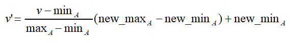 对给定的数值属性A,[minA,maxA]为A规格化前的取值区间,[new_minA,new_maxA]为A规格化后的取值区间,最小-最大规格化根据下式将A的值v规格化为值v':