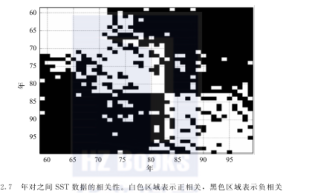 【案例】 不一致的海洋表面温度 该例解释实际的时间序列数据中的不一致性。这些数据是在海洋的不同点测量的海洋表面温度(SST)。最初人们利用船或浮标使用海洋测量方法收集SST数据,而最近开始使用卫星来收集这些数据。为了创建长期的数据集,需要使用这两种数据源。然而,由于数据来自不同的数据源,两部分数据存在微妙的不同。这种差异显示在图2.7中,该图显示了各年度之间SST值的相关性。如果某两个年度的SST值是正相关的,则对应于这两年的位置为白色,否则为黑色。(季节性的变化从数据中删除,否则所有的年都是高度相关的。)数据汇集在一起的地方(1983年)有一个明显的变化。在1958~1982年和1983~1999年两组中,每组内的年相互之间趋向于正相关,但与另一组的年负相关。这并不意味着该数据不能用,但是分析者应当考虑这种差异对数据挖掘分析的潜在影响。