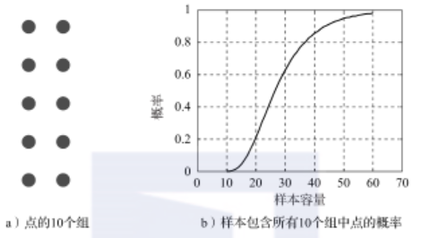 使用抽样可以有效地解决该问题。一种方法是取数据点的一个小样本,逐对计算点之间的相似性,然后形成高度相似的点组。从每个点组取一个点,则可以得到具有代表性的点的集合。然而,按照该方法,需要确定样本的容量,它以很高的概率确保得到期望的结果,即从每个簇至少找出一个代表点。图b显示了随着样本容量从10变化到60,从10个组的每一个组中得到一个对象的概率。有趣的是,使用容量为20的样本,只有很小的机会(20%)得到包含所有10个组的样本。即便使用容量为30的样本,得到不包含所有10个组中对象的样本的概率也很高(几乎40%)。