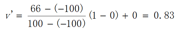 例如,某属性规格化前的取值区间为[-100,100],规格化后的取值区间为[0,1],采用最小-最大规格化属性值66,变换方式为: