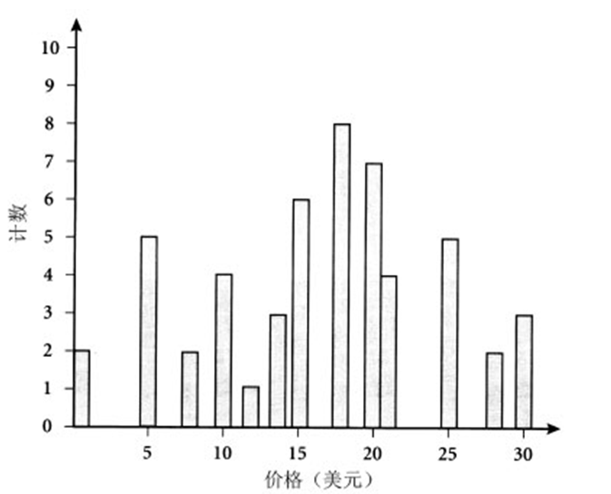 【例】直方图。下面的数据是AllElectronics通常销售的商品的单价表(按美元取整)。已对数据进行了排序:1, 1, 5, 5, 5,5, 5, 8, 8, 10, 10, 10, 10, 12, 14, 14, 14, 15, 15, 15, 15, 15, 15, 18, 18, 18, 18, 18, 18, 18, 18, 20, 20, 20, 20, 20, 20, 20, 21, 21, 21, 21, 25, 25, 25, 25, 25, 28, 28, 30, 30, 30。