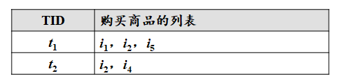 事务数据库(transactional databases)D={t1,t2,…,tn}是一个事务(transaction)的集合,每个事务ti(1≤i≤n)都对应I上的一个子集,其中ti是事务的唯一标识,i表示事务的序号。