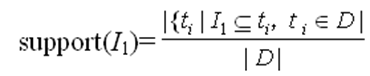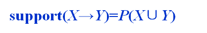 其中,|•|表示•集合的计数,即其中元素个数。对于形如X→Y的关联规则,其支持度定义为: