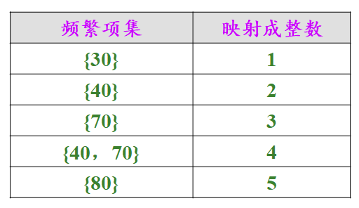 然后将频繁1-项集映射成连续的整数。例如,将上面得到的L1映射成下表对应的整数。