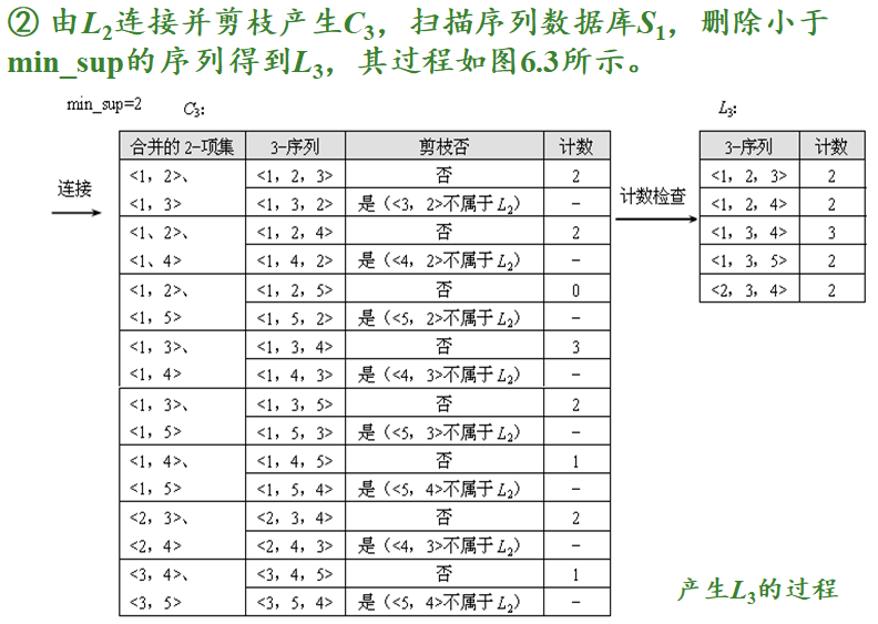 剪枝的原则:一个候选k-序列,如果它的(k-1)-序列有一个是非频繁的,则删除它。