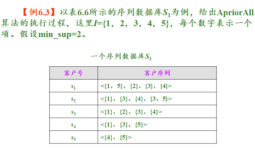 【例6.4】对于表6.5所示的序列数据库S1,从前面的过程看到,产生的所有频繁序列集合:L={<1>,<2>,<3>,<4>,<5>,<1,2>,<1,3>,<1,4>,<1,5>,<2,3>,<2,4>,<3,4>,<3,5>,<4,5>,<1,2,3>,<1,2,4>,<1,3,4>,<1,3,5>,<2,3,4>,<1,2,3,4>}