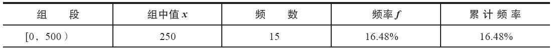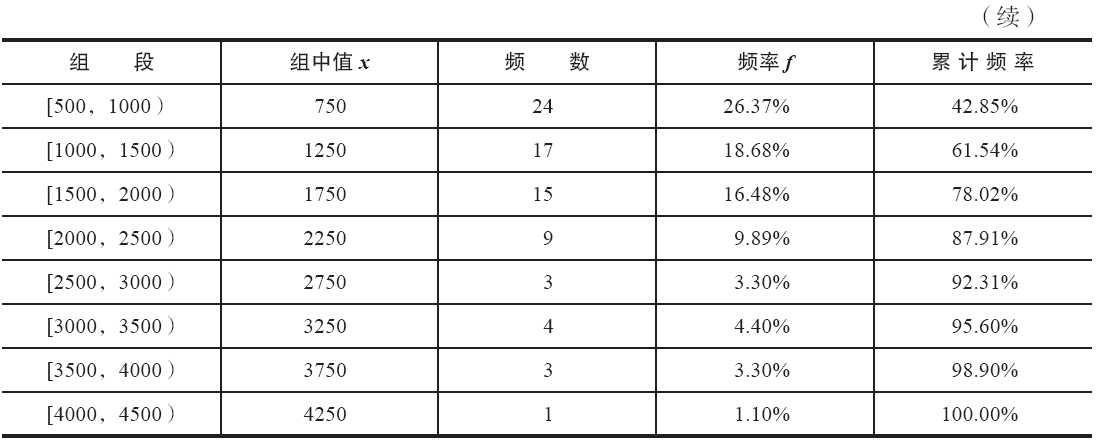 根据分组区间得到如表所示的频率分布表。其中,第1列将数据所在的范围分成若干组段,第1个组段要包括最小值,最后一个组段要包括最大值。习惯上将各组段设为左闭右开的半开区间,如第一个分组为[0,500)。第2列组中值是各组段的代表值,由本组段的上、下限相加除以2得到。第3列和第4列分别为频数和频率。第5列是累计频率,是否需要计算该列视情况而定。