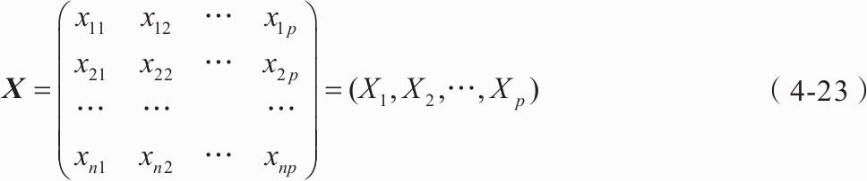 1)设原始变量X1,X2,…,Xp的n次观测数据矩阵为式(4-23)。