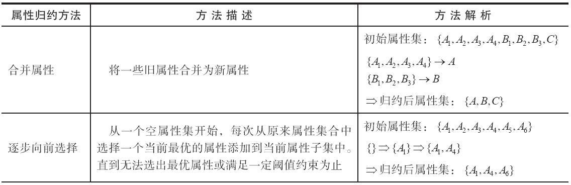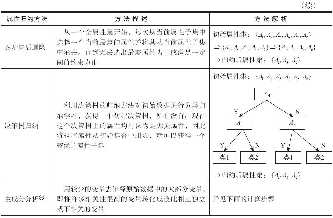 属性归约通过属性合并创建新属性维数,或者通过直接删除不相关的属性(维)来减少数据维数,从而提高数据挖掘的效率,降低计算成本。属性归约的目标是寻找最小的属性子集并确保新数据子集的概率分布尽可能接近原来数据集的概率分布。属性归约常用方法见表。