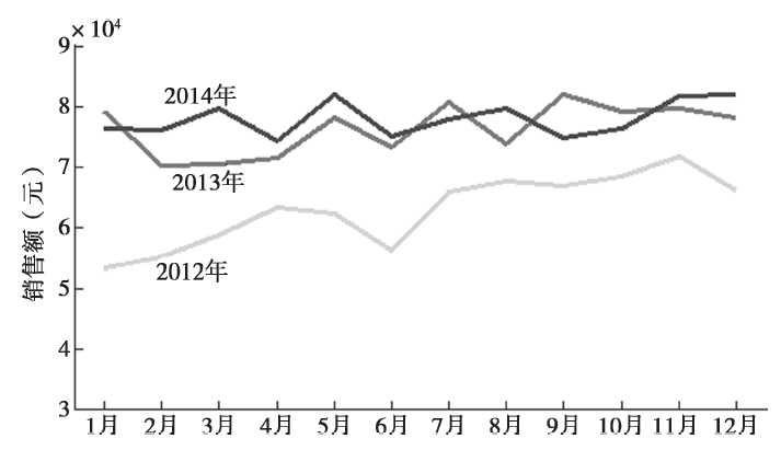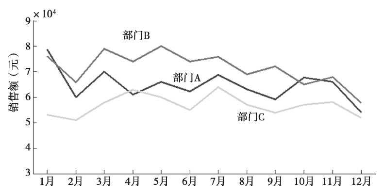 就各菜品的销售数据来看,从时间的维度上分析,可以看到甜品部A、海鲜部B、素菜部C三个部门之间的销售金额随时间的变化趋势,可以了解在此期间哪个部门的销售金额较高,趋势比较平稳,如图所示。