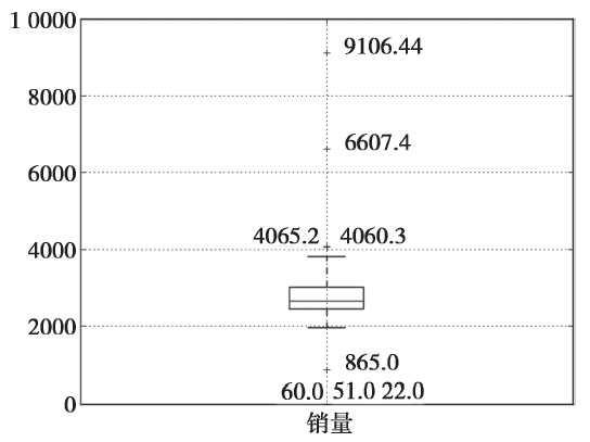 可以看出,箱型图中超过上下界的7个日销售额数据可能为异常值。结合具体业务可以把865.0、4060.3、4065.2归为正常值,将22.0、51.0、60.0、6607.4、9106.44归为异常值。最后确定过滤规则为日销额在400元以下或5000元以上则属于异常数据,编写过滤程序,进行后续处理。