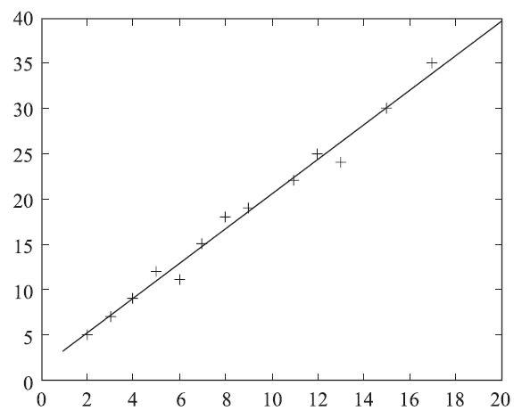 例如,把点(2,5),(3,7),(4,9),(5,12),(6,11),(7,15),(8,18),(9,19),(11,22),(12,25),(13,24),(15,30),(17,35)归约成线性函数。即拟合函数线上对应的点可以近似看作已知点。如图4-9所示。
