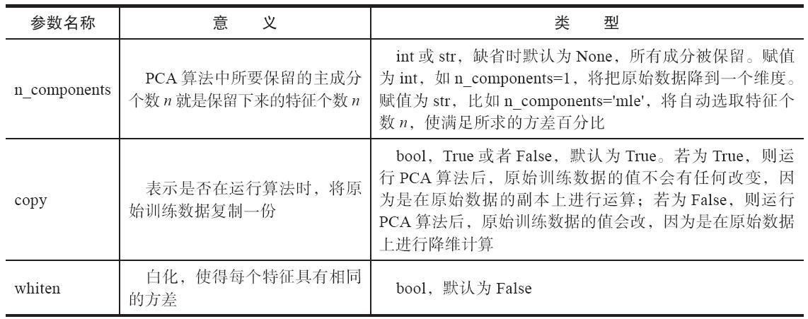 在Python中,主成分分析的函数位于scikit-learn库下,其使用格式如下,参数说明如表4-9所示。